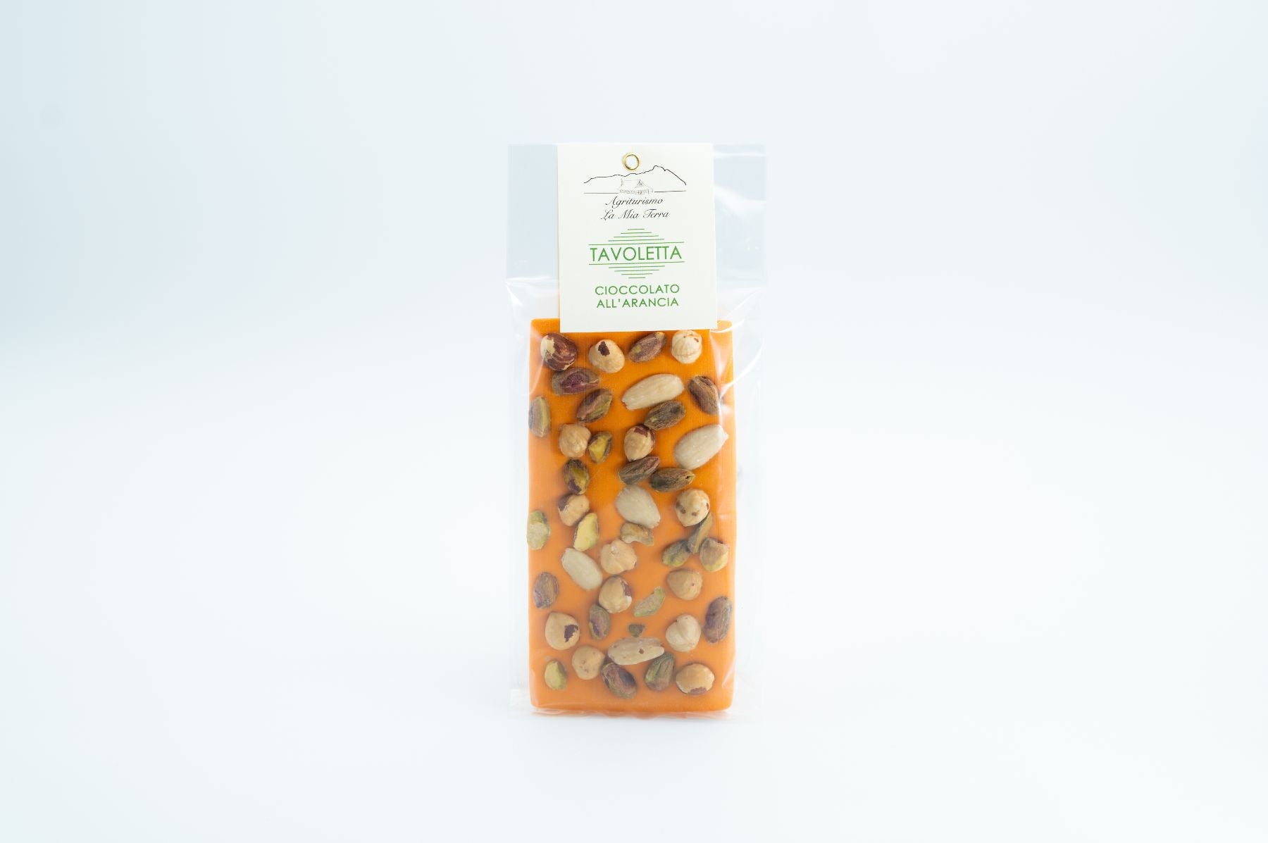 Ingredienti: Cioccolato all’arancia: zucchero, burro di cacao (29%), latte in polvere, emulsionante: lecitina di soia, aroma naturale di arancio, colorante: E160e, aroma naturale di vaniglia. Noci, Mandorle, Pistacchi, Nocciole Allergeni: Latte, soia, frutta a guscio.