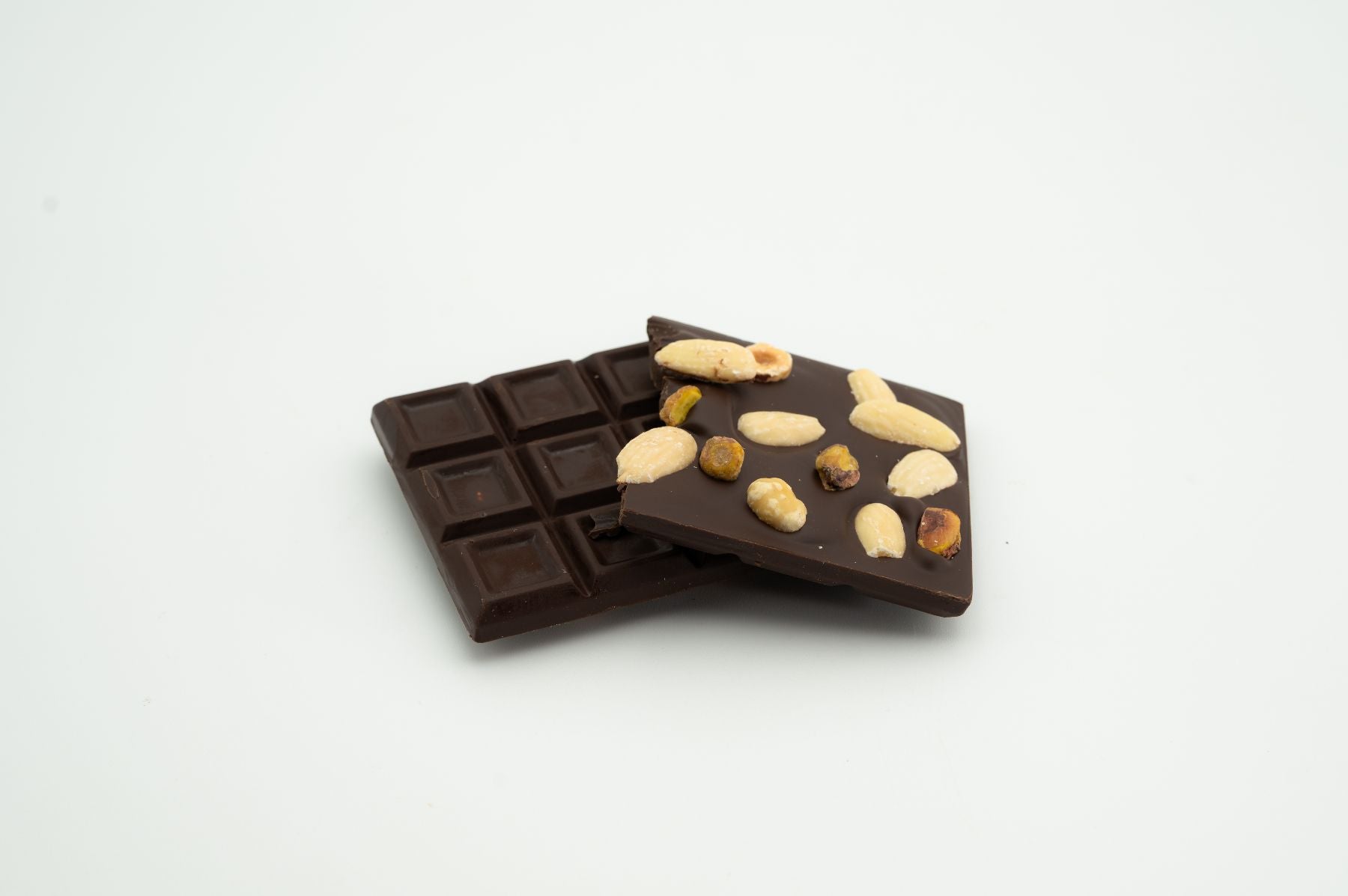 Ingredienti: Cioccolato fondente 64%: pasta di cacao, zucchero, emulsionante: lecitina di soia, aroma naturale di vaniglia. Noci, Mandorle, Pistacchi, Nocciole Allergeni: Latte, soia, frutta a guscio.